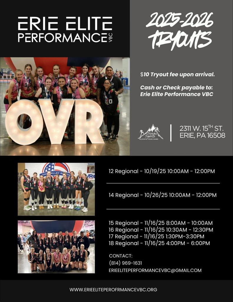 Secure your spot at Erie Elite Performance VBC tryouts! Click the link to register for the 2025-2026 Season Tryouts today.